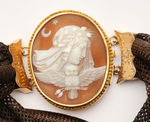 Leicht dehnbares Band aus fünf ineinander verdrehten Hohlgeflechten, wovon die zwei breiten geschlossen, die drei schmalen durchbrochen gefertigt sind. Die Enden in kastenförmigen geschweiften Fassungen, diese je mit einer zentralen Blume auf Wiese und einer Rahmung aus Perlfries und Voluten versehen. Die Fassungen mit je zwei festen Ösen, die mit jenen des mittigen ovalen Medaillons verbunden sind. Dieses besteht aus einer in Gold gefassten Kamee aus erhabenem weissem Relief auf braunem Grund. Frauenkopf im Profil nach rechts mit Schleier und Haarband aus Blüten neben Mondsichel und Stern. Unter dem Kinn eine flügelspreizende Eule, die zwei Mohnhalme mit geschlossenen Kapseln in ihren Fängen hält. Rahmung aus Perlfries. Schloss mit Schnäpper in seitlicher Medaillonwandung.