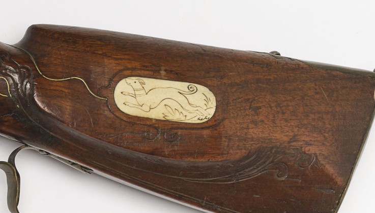 Dekorelemente in Form von graviert gebänderten Ladestockpfeifen, hintere Pfeife mit Verlängerung in Form einer Blume mit Blüte in Elfenbeineinlage. Weitere Elfenbeineinlage auf Backenstütze in ovaler Form mit graviertem geschwärztem Hund. Kolben und Schafthals mit eingelegtem Messingdraht in Form von Spiralen, Wellen, Ranken, Blattformen und Kartuschen um Schloss- und Seitenplatte. Hinter Laufangel geschnitzte Blüte. Abzugsbügelblatt, Kolbenkappe und Seitenplatte mit Enden in Blattform.
