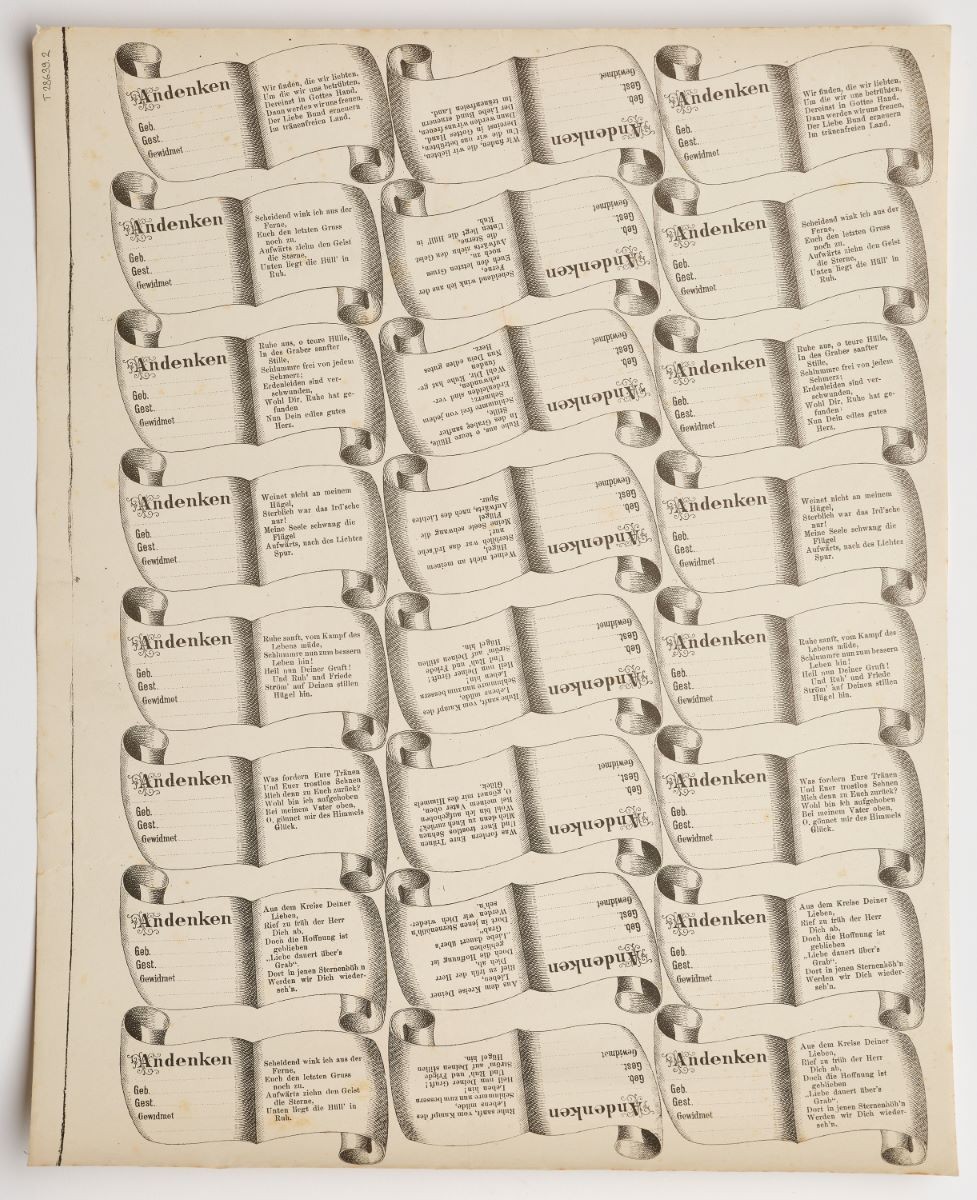 24 Etiketten mit sieben unterschiedlichen Sprüchen, wovon drei vierfach und vier dreifach vorhanden sind und die mittlere Spalte auf dem Kopf steht. Auf der linken Seite der Etikette die Beschriftung «Andenken», der Anfangsbuchstabe als Initiale mit Ranken verziert, darunter fünf Zeilen mit gedruckten Angaben «Geb.», «Gest.» und «Gewidmet» zum Eintragen des Geburts- und Sterbedatums sowie des Namens der verstorbenen Person.