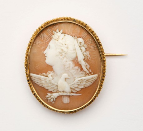 Goldgefasste hochovale Kamee aus erhabenem weissem Relief auf braunem Grund. Im Strahlenkranz liegender Frauenkopf im Profil nach links, mit nach hinten gekämmtem, mit einem Band oben zusammengebundenem und mit Blüten geschmücktem Haar, einige Locken im Nacken und weiteres Blütenband auf Vorderkopf. Unter der Büste Taube (Symbol des Friedens), die auf einem Füllhorn (Symbol des Wohlstandes) sitzt und die Flügel spreizt. Rahmung aus Perlfries. Rückseitige an Scharnier befestigte Nadel, durch offene Öse geführt. Weitere geschwungene Öse im unteren Scheitelpunkt des Medaillons, damit dieses an Kette getragen werden konnte. Allerdings liegt das Medaillon bei dieser Tragweise verkehrt auf.