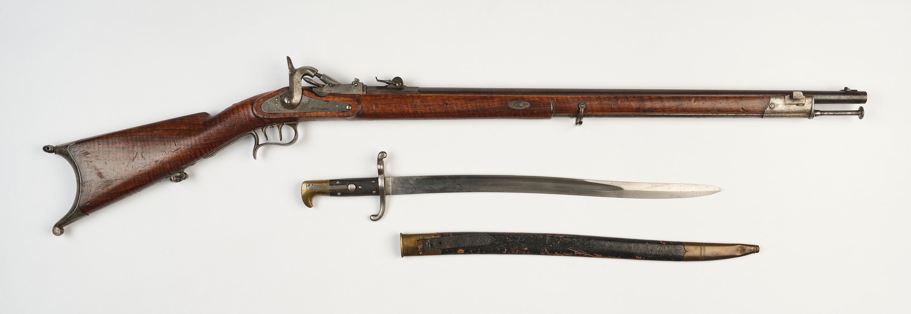 Feldstutzer der Thurgauer Scharfschützen, Hinterlader mit Kippklappverschluss nach dem System Milbank-Amsler, eidgenössisches Modell 1864/1867, mit Jatagan (Säbelbajonett) Modell 1864/1867