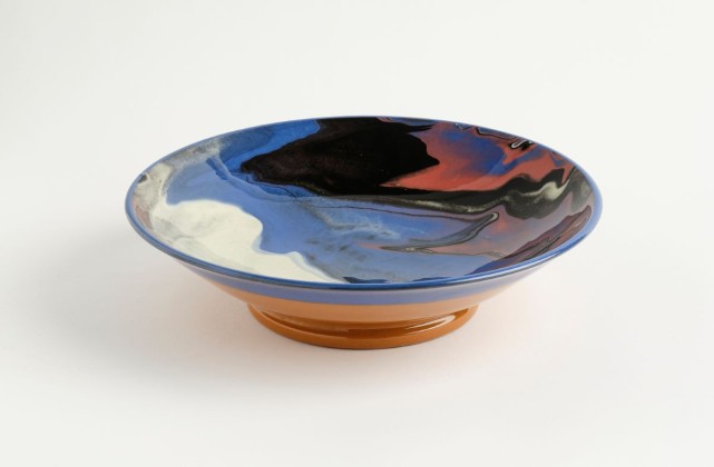 Runde, leicht muldige Schüssel auf eingezogenem Standring, der unten wulstig ausgeschwungen ist. Innenwandung mit marmoriertem Farbverlauf in Blau, Schwarz, Weiss und Pink. Blauer, einige Millimeter über die Aussenwandung reichender Rand. Aussenwandung scherbensichtig.