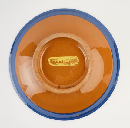 Aus der Serie Ermatingen, daher auf der Unterseite des Bodens «Ermatingen» in Kratztechnik (Sgraffito) in ein gelbes Rechteck geschrieben, weshalb die Buchstaben die Farbe des Scherbens haben.