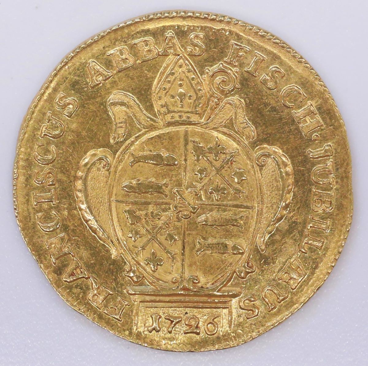 Vs.: Umschrift: «FRANCISCUS ABBAS FISCH . JUBILAE[AE ligiert]US». In Strichelkreis ovaler gevierter Wappenschild mit Stifts- (Felder 1 und 4) und Familienwappen (Felder 2 und 3), auf der Stirnseite des Podests die Jahreszahl «1726», über dem Wappen Mitra (Kopfbedeckung der Bischöfe sowie von bestimmten Äbten mit Rechts- und Verwaltungshoheit), Stola und Krummstab (Symbol des Abts als Hirte der Gläubigen). Rechts und links am Wappenschild angesetzte volutenförmige Ohren.