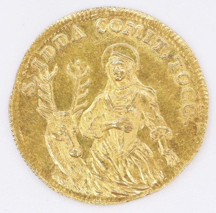 Rs.: Umschrift: «S . IDDA COMIT . TOGG». In Strichelkreis die stehende hl. Idda. Links neben ihr der zwölf Lichter tragende Hirsch, der Idda jeden Tag zur Messe geleitet.