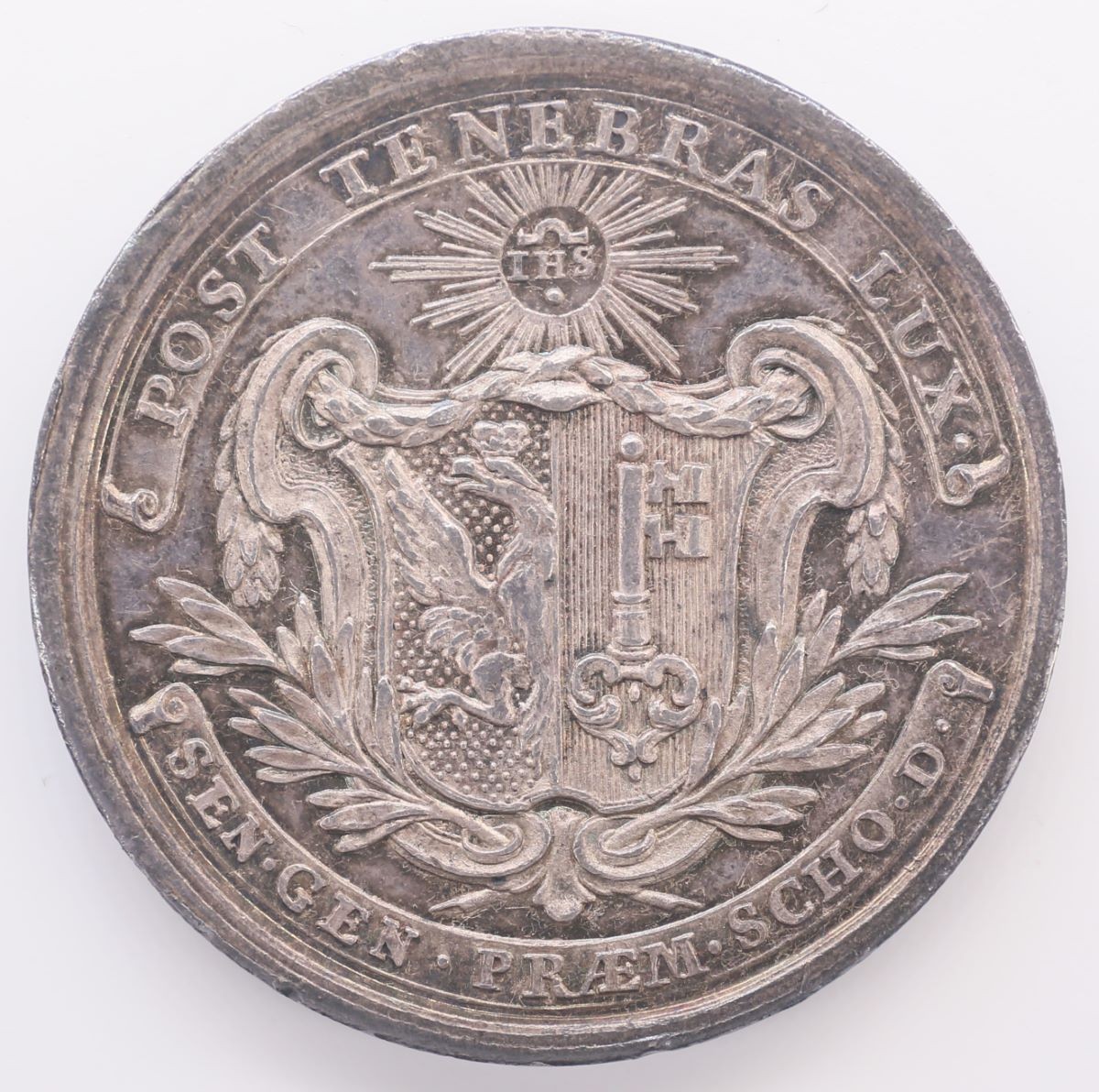 Vs.: Umschrift in zwei Schriftrollen: «POST TENEBRAS LUX .», (Nach der Finsternis das Licht; Leitspruch der Calvinisten und der Republik Genf) – «SEN . GEN . PRAE[AE ligiert]M . SCHO . D .», (SENATVS GENEVENSIS SCHOLASTICIS PRAEMIAM MAERITI DEDIT, Der Genfer Senat gibt den Schülern die verdiente Belohnung). In mehrfachem Linienkreis geschweifter Genfer Wappenschild in von einer Girlande behängter Kartusche aus Rollwerk, welche vom Christusmonogramm «IHS» in Strahlenkranz überhöht wird, unten gekreuzte Lorbeerzweige (Symbole des Siegs und Ruhms) aus Rollwerk tretend.