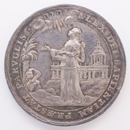 Rs.: Umschrift: «LEX DEI SAPIENTIAM PRAE[AE ligiert]STAT PARVULIS .» (Das Gesetz Gottes gewährt den Kindern Weisheit). In doppeltem Linienkreis Fides, die Verkörperung der christlichen Tugend des Glaubens in Person einer stehenden Frau mit aufgeschlagenem Buch auf ihrem rechten Arm, mit dem linken Zeigefinger auf eine Textstelle zeigend und nach links oben blickend, wo der Name Gottes «IEHOVA» in Hebräisch über Wolken und Strahlen steht. Links vor Fides die liegende Sapientia (Verkörperung der Weisheit), welche aus ihrem Busen die Milch der Wissenschaft fliessen lässt. Im Hintergrund tempelartiges Gebäude mit Kolonnadenfront.