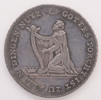 Rs.: Umschrift: «(Strahlenkranz) GOTTES FORCHT IST ZU ALLEN DINGEN NUTZ». In Strichelkreis der Harfe spielende König David nach links, auf einem Kissen kniend, am Boden links seine Krone.