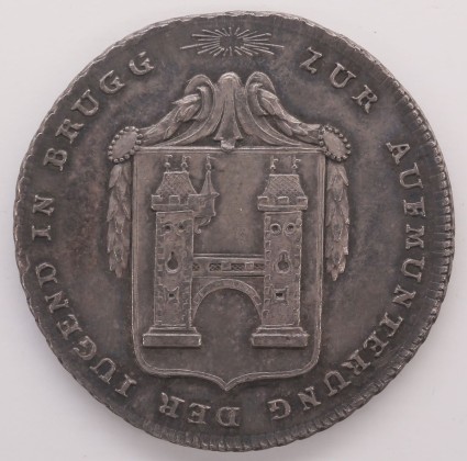Vs.: Umschrift: «(Strahlenkranz) ZUR AUFMUNTERUNG DER JUGEND IN BRUGG». In Strichelkreis Wappen von Brugg im Schild in französischer Form, auf beiden Schildseiten herabhängende Lorbeerblätter-Festons, die im Scheitel oben aus einem Rollwerk entspringen und je ein mit Perlen gefasstes ovales, auf den oberen Schildecken liegendes Medaillon aufweisen.