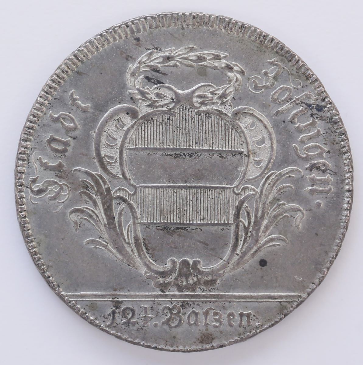Vs.: Umschrift: «STADT – ZOFINGEN .». In Strichelkreis Wappen von Zofingen in birnenförmiger barocker Kartusche aus Voluten, Bogen mit angesetzten Muschelohren und Muschel unten, darüber ein Lorbeerkranz (Symbol des Siegs und Ruhms), zwischen Palmzweigen (Symbole des Siegs und Friedens), im Abschnitt die Angabe «12 1/2 BATZEN .».