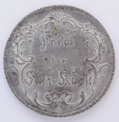 Rs.: In Strichelkreis die Angaben «PREISS / DER / SING=KUNST» in geschweifter barocker Kartusche aus Rocaillen, Blattranken, Girlanden aus Blüten sowie je einer Muschel oben und unten.