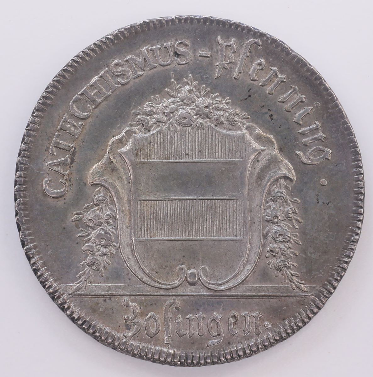Medaille: Schulprämie für die städtische Schule in Zofingen (AG), sogenannter Katechismuspfennig für Schüler und Schülerinnen im Wert von 50 Kreuzern, welche im Rezitieren des Katechismus gute Leistungen erzielten, aus der ehemaligen Sammlung von Josef Sager (1905–1964)
