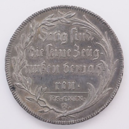 Rs.: In Strichelkreis die Angaben «Selig sind / die seine Zeüg- / nußen bewah- / ren . / PS . CXIX . / 2 .» (Psalm 119, Vers 2), zwischen linkem Lorbeer- und rechtem Palmzweig (Symbole des Siegs, Ruhms und Friedens).