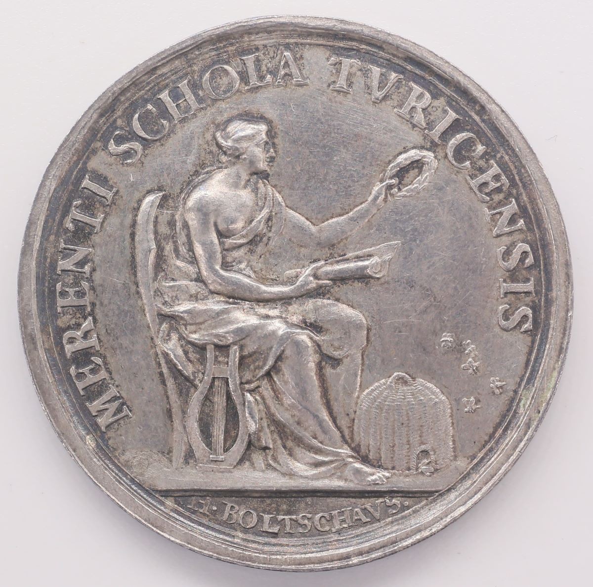 Vs.: Umschrift: «MERENTI SCHOLA TVRICENSIS», (Auszeichnung der Zürcher Schule). In doppeltem Linienkreis sitzende weibliche Figur (Kalliope, Muse der epischen Dichtung, der Rhetorik, der Philosophie und der Wissenschaft) nach rechts, mit der Linken einen Lorbeerkranz (Symbol des Siegs und Ruhms, hier der Auszeichnung), mit der Rechten eine Schriftrolle (Symbol der Bildung) haltend, vor ihr ein Bienenkorb mit fünf Bienen (Symbol des Fleisses), eine Leier an den Stuhl gelehnt (Symbol der Poesie), im Abschnitt die Signatur «H. BOLTSCHAVS .».