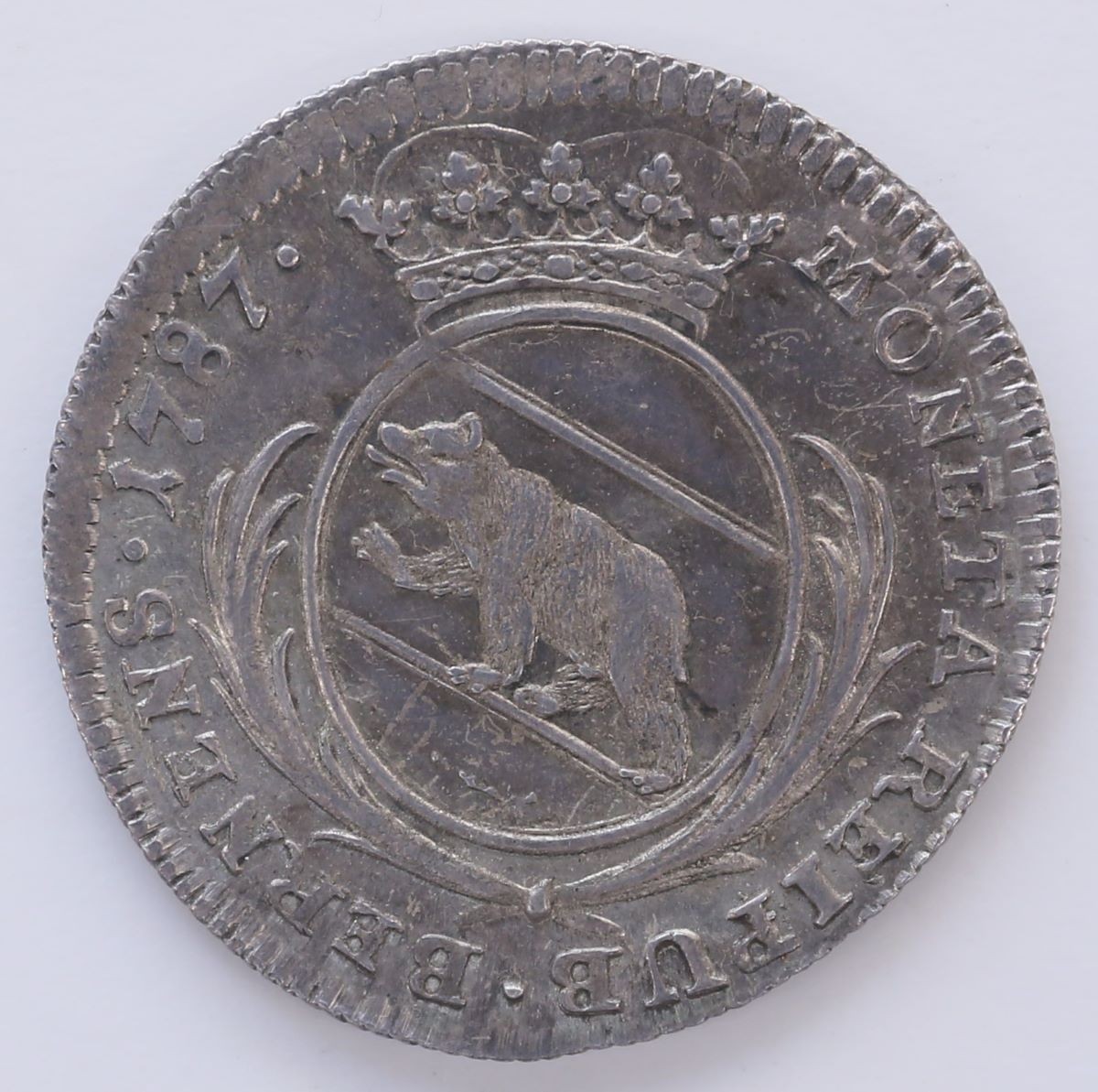 Vs.: Umschrift: «MONETA REIPUB . BERNENS . 1787 .». In Strichelkreis mit Lilienkrone bekröntes Berner Wappen in ovalem Schild (heraldisch nach rechts aufwärtsschreitender Bär mit erhobener linker Vordertatze), seitlich flankiert von Palmzweigen (Symbole des Siegs und Ruhms).
