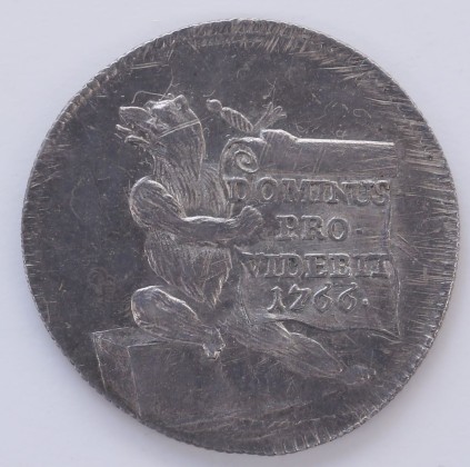 Rs.: In Strichelkreis auf einem Block in menschlicher Manier sitzende, nach links blickende Bärin, die mit ihren Tatzen eine aufgerollte Schrift hält, diese mit den Angaben «DOMINUS / PRO . / VIDEBIT / [Der Herr wird vorsorgen, Gen 22, 8] 1766 .». Hinter der Schriftrolle sind der Griff und die Parierstange einer Stich- oder Hiebwaffe sichtbar.