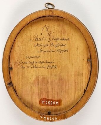 In ovalem Holzrahmen mit Messingbeschlag. Rückseitige Holzabdeckung beschriftet «FG C – SE Paul v. Gontzenbach Königl. Preussischer Ingenieur Major. Gezeichnet in Graudenz in West Preussen den 12[ten] November 1788.».