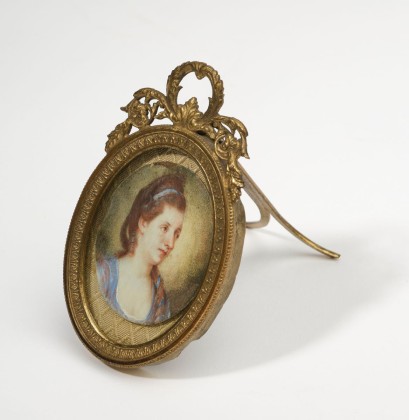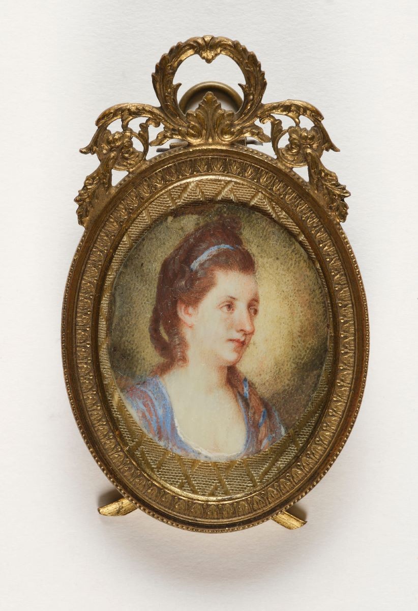Die feine Malerei liegt im hochovalen Metallrahmen aus der Zeit, oben mit Blattranken als Aufhängevorrichtung, auf der Rückseite ausklappbar, um das Bild auf eine Fläche stellen zu können.