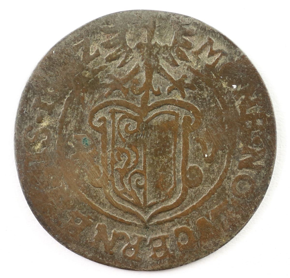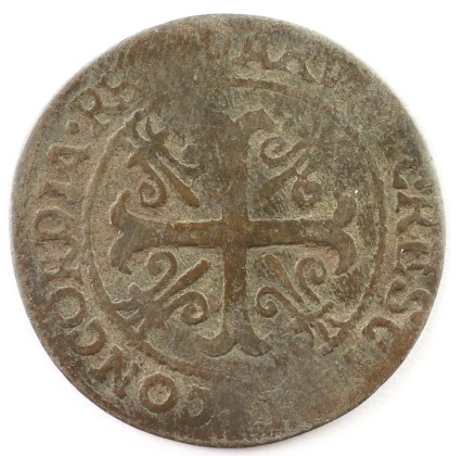 Rs.: Zwischen äusserem Gerstenkornkreis und innerem Schnurkreis Umschrift: «(Rosette) CONCORDIA . RES . PARVAE . CRESCVNT» (Durch Eintracht wächst das Kleine. Satzteil aus dem Werk «Bellum Iugurthinum» Kp. 10 vom römischen Geschichtsschreiber Gaius Sallustius Crispus alias Sallust, der ganze Satz lautet «Durch Eintracht wächst das Kleine, durch Zwietracht zerfällt das Grösste»). In Linienkreis Ankerkreuz (Sinnbild mit zwei verschiedenen Motiven, dem Anker, der für die Standhaftigkeit des Glaubens steht, und dem Kreuz, das den Opfertod von Jesus Christus symbolisiert). Je eine Lilie (Symbol der Reinheit und königlichen Macht) in den Zwickeln.