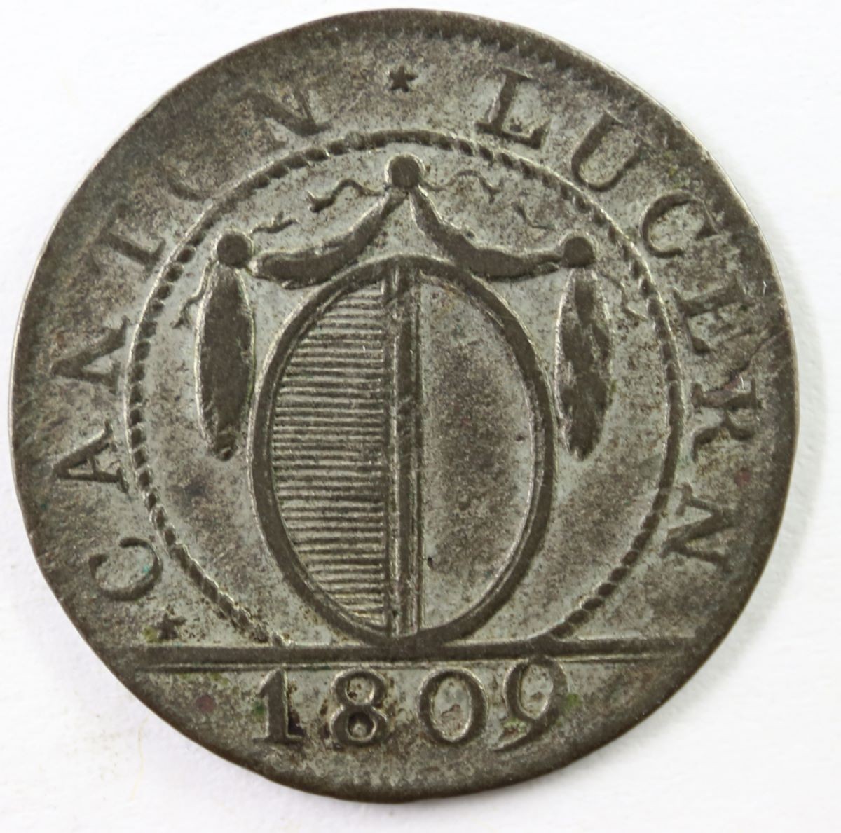Vs.: In Strichelkreis Umschrift: «(Stern) CANTON (Stern) LUCERN (Stern)». In Schnurkreis Luzerner Wappen in ovalem Schild, unter in geschwungenen Bögen verlaufender sowie links und rechts senkrecht herabhängender Blattgirlande, im Abschnitt die Jahreszahl «1809».