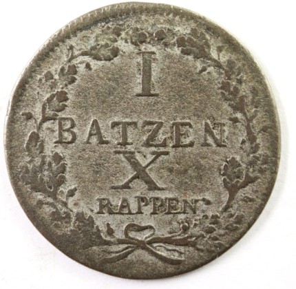 Rs.: In Strichelkreis die Angaben «I / BATZEN / X / RAPPEN» in zum Kranz geformten, unten mit Schleife gebundenen Eichenzweigen mit Eicheln (Symbol der Stärke, Treue und Einheit).