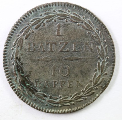 Rs.: In Strichelkreis die Angaben «1 / BATZEN / 10 / RAPPEN» in Lorbeerkranz (Symbol des Siegs und Ruhms).