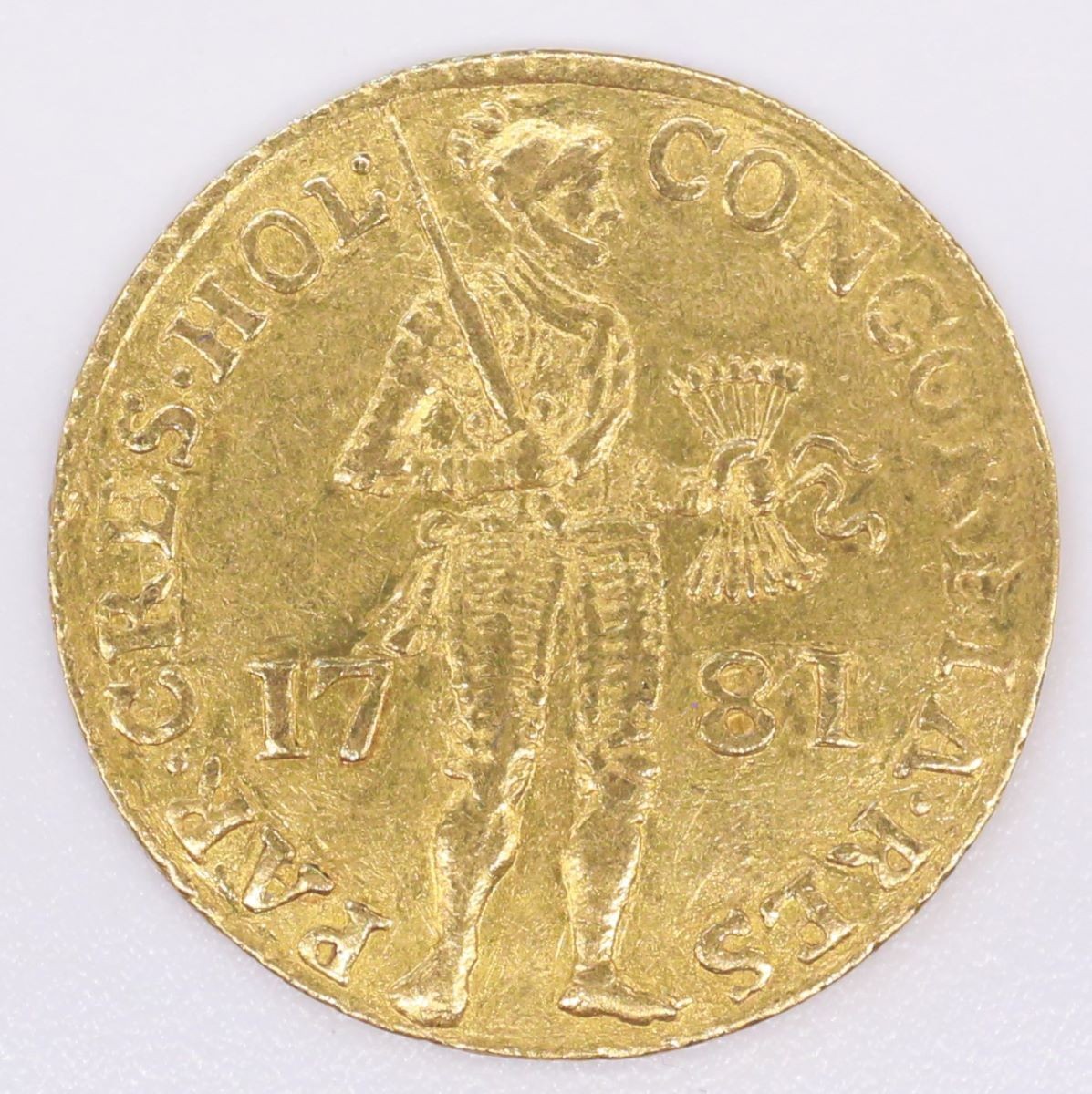 Vs.: Umschrift: «CONCORDIA . RES – PAR . CRES . HOL .» (Concordia Res Parvae Crescunt – Hollandia) (Durch Eintracht wächst das Kleine – Holland). In Linienkreis geharnischter stehender Krieger nach rechts, zwischen 17 – 81, in der Rechten das geschulterte Schwert (Allegorie der Wehrhaftigkeit und militärischen Stärke) haltend, in der Linken ein Pfeilbündel (Symbol der Einigkeit).