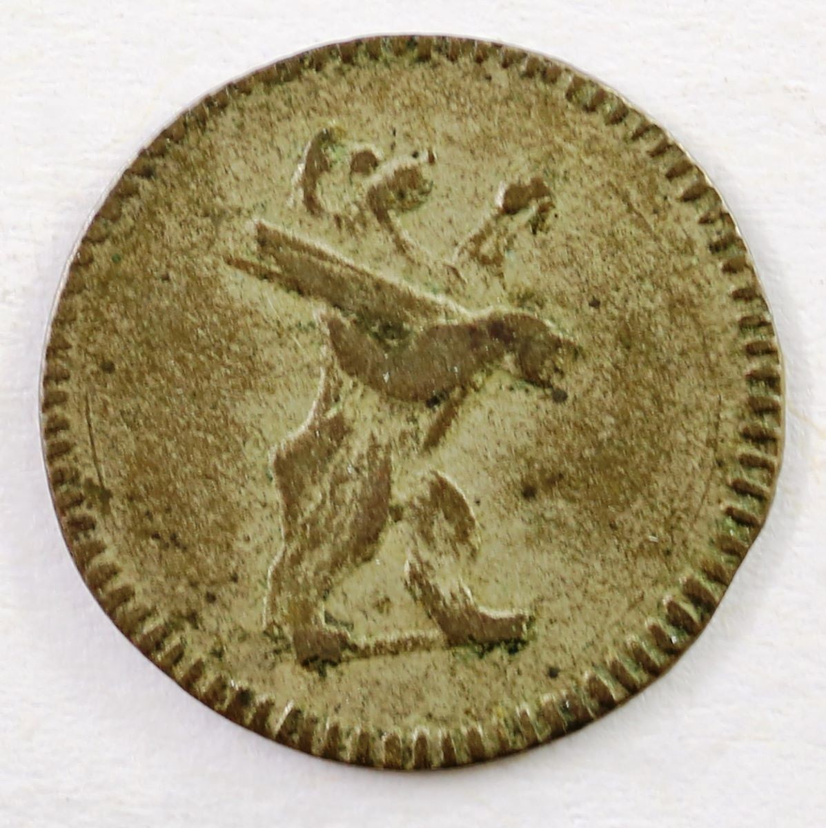 Vs.: In Strichelkreis ein aufrecht stehender und heraldisch nach links schreitender Bär, mit einem Stück Holz auf der Schulter.