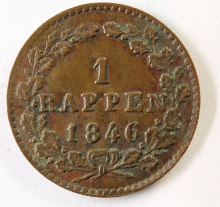 Rs.: In Gerstenkornkreis die Angaben «1 / RAPPEN / 1846» zwischen unten mit einer Schleife zum Kranz gebundenen Eichenzweigen.