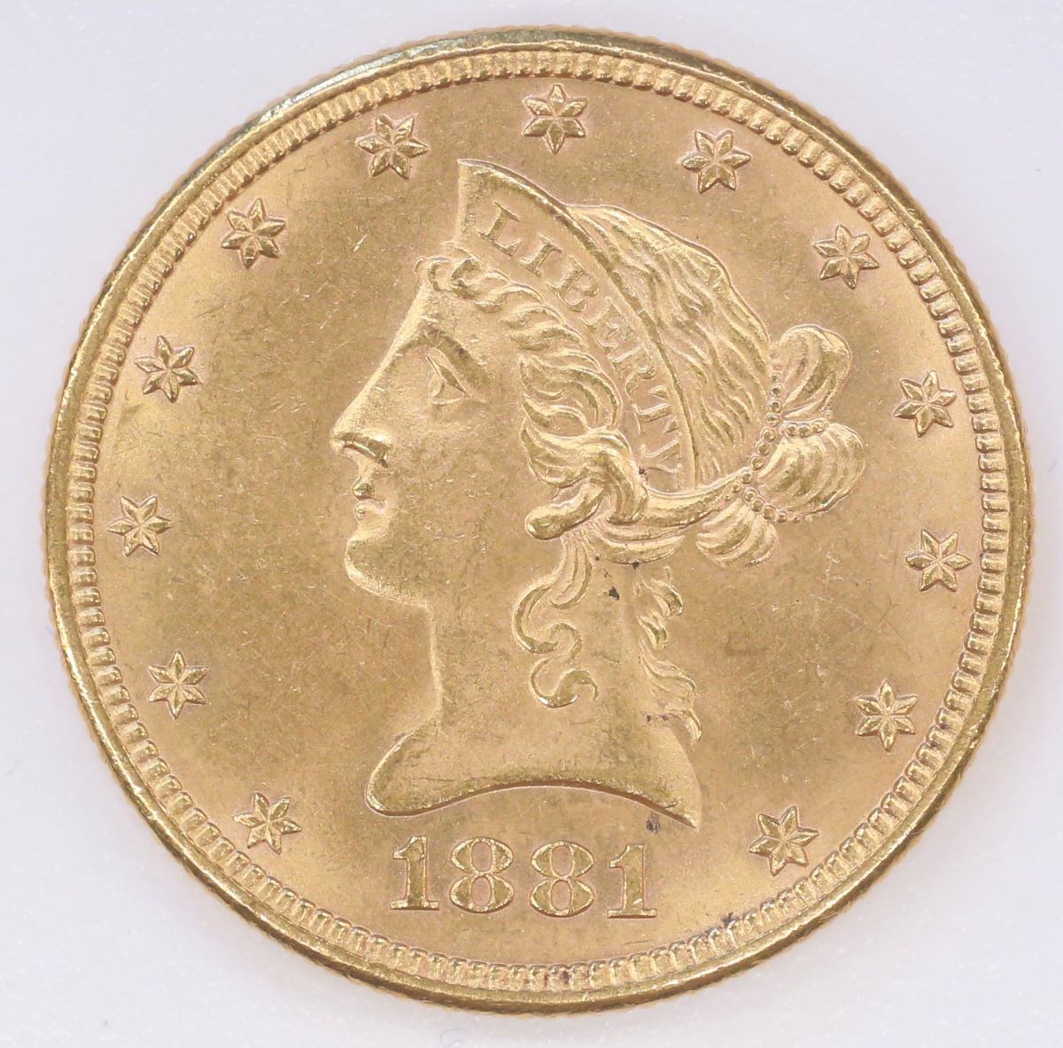 Vs.: In Perl- und Linienkreis weiblicher Kopf nach links, Profil nach dem griechischen Ideal mit Stirn- und Nasenbein in gerader Linie und kleinem gerundeten Kinn, auf Hinterkopf mit Perlenkette geschmückter Haarknoten und über Stirn Diadem mit Inschrift «LIBERTY» (Allegorie der Freiheit), umgeben von 13 Sternen, darunter Jahreszahl «1881».