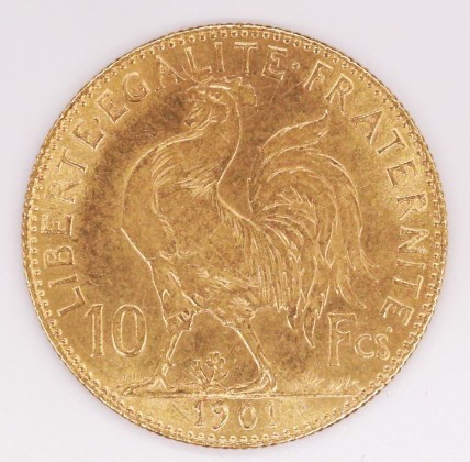 Rs.: Umschrift: «LIBERTE . EGALITE . FRATERNITE .» (Freiheit, Gleichheit, Brüderlichkeit). Gallischer Hahn (Allegorie des stolzen und wehrhaften Frankreichs) nach links, zwischen «10 – Fcs», im Abschnitt: «1901».