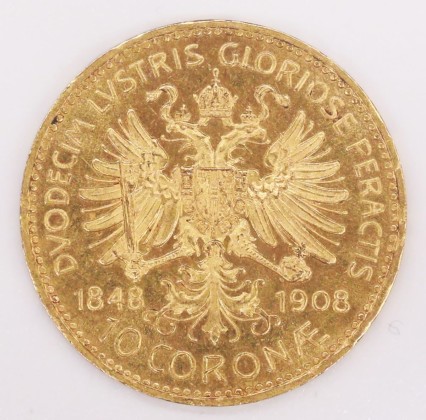 Am 3. Dezember 1908 feierte Kaiser Franz Joseph I. von Österreich sein 60. Thronjubiläum. Zu diesem Anlass wurden eine Reihe von Feierlichkeiten abgehalten und Münzen ausgegeben wie das vorliegende 10-Kronen-Stück, dessen Rückseite mittels der Umschrift und den beiden Jahreszahlen 1848 und 1908 Bezug zum Thronjubiläum nimmt. Die Zeitangabe in Lustren (Zyklus von 5 Jahren) orientiert sich am Rhythmus der in der römischen Antike üblichen Regierungsjubiläen. Die Umschrift betont die segensreiche Herrschaft des gefeierten Monarchen. Der bekrönte Doppeladler mit dem dreigeteiltem Hauswappen der Familie Habsburg-Lothringen (habsburgischer Löwe, Bindenschild für Österreich und Schrägbalken mit drei Adlern für Lothringen) auf der Brust war seit 1804 das offizielle kleine (einfache) Staatswappen des Kaisertums Österreich.