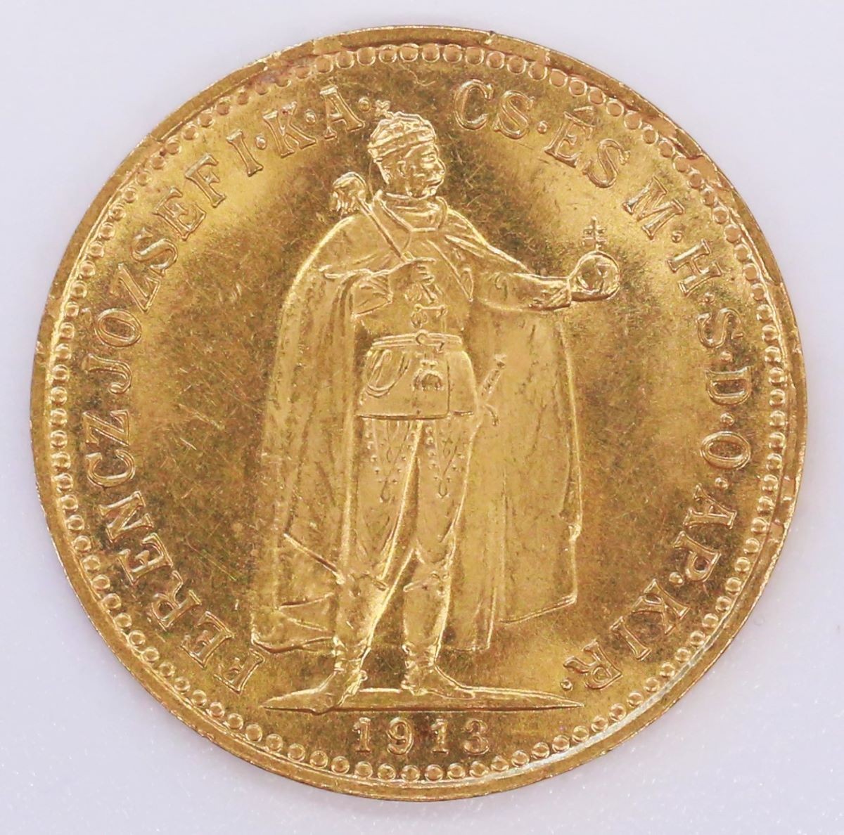 Vs.: Umschrift: «FERENCZ JÓSEF I . K . A . – CS . ÉS M . H . S . D . O . AP . KIR .» (FERENCZ JÓSEF ISTEN KEGYELEMBÖL AUSZTRIAI CSÁSZÁR, ÉS MAGYAR, HORVÁT, SZLAVÓNIAI ÉS DALMATIAI APOSTOL KIRÁLY) (Franz Josef von Gottes Gnaden Kaiser von Österreich und Apostolischer König von Ungarn, Kroatien, Slawonien und Dalmatien). In Perl- und Linienkreis stehender König im Krönungsornat mit Zepter und Reichsapfel, nach rechts, im Abschnitt «1913».
