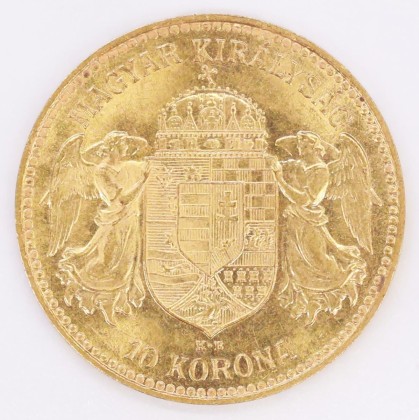 Infolge der Niederlage von Kaiser Franz Joseph I. im Deutsch-Österreichischen Krieg von 1866 gelang es dem Königreich Ungarn ein Jahr später eine eigenständige Stellung innerhalb des habsburgischen Gesamtstaats zu erlangen. Das Habsburgerreich war somit ab 1867 in zwei weitgehend unabhängige Reichshälften geteilt, welche durch die Person des Monarchen, die gemeinsame Aussenpolitik und die K. u. K. (Kaiserlich und Königliche) Armee verbunden waren. Diese politische Situation war auch in der Gestaltung der Münzen sichtbar. Zwar wurden die Geldstücke in der gleichen Währung und nach dem gleichem Standard (Wertabstufung und Metall) ausgegeben, doch die Motive der Münzen der Reichsteile unterschieden sich deutlich voneinander. Während die Münzen der österreichischen Landeshälfte jeweils auf der Rückseite den Doppeladler bzw. die Rudolfskrone zeigen, weisen die ungarischen Prägungen das mittlere ungarische Reichswappen auf, das die verschiedenen Wappen der einst im Königreich Ungarn vereinten Länder zeigt. Zudem ist auf ungarischen Kleinmünzen die Stephanskrone (nationales Symbol) abgebildet. Die Gestaltung des vorliegenden 10-Kronen-Stücks präsentiert das exemplarisch. Die Vorderseite wird vom stehenden König im ungarischen Krönungsornat (Kleid) mit geschultertem Zepter, dem Reichsapfel und der Stephanskrone dominiert, während die Rückseite das mittlere ungarische Reichswappen zeigt. Der ebenfalls von der Stephanskrone bekrönte Schild zeigt von links oben nach rechts unten die Wappen Dalmatiens (drei Löwenköpfe), Kroatiens (Schachbrettmuster), Slawoniens (Marder nach links, darüber Stern), Siebenbürgens (halber Adler zwischen Halbmond und Sonne, darunter sieben Burgen), Bosnien-Herzegowinas (Arm mit Krummschwert) und Fiumes (heute Rijeka) (Doppeladler auf einem Krug, aus dem Wasser in einen Fluss mündet). Inmitten dieser Wappen der zweigeteilte ungarische Wappenschild mit den acht rotweissen Querstreifen für Alt-Ungarn und dem Doppelkreuz auf einem Dreiberg für Neu-Ungarn liegt.