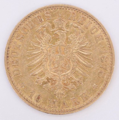 Rs.: Umschrift: «DEUTSCHES – REICH 1878 – (Sternchen) 10 MARK (Sternchen)». In Perl- und Linienkreis bekrönter deutscher Reichsadler nach links.