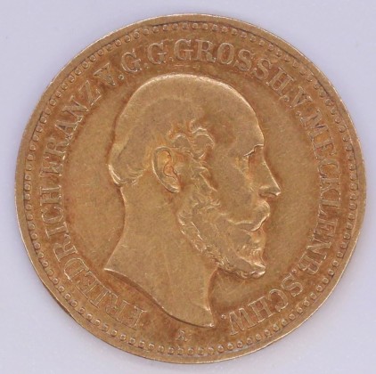 Münze: 10-Mark-Stück des Grossherzogtums Mecklenburg-Schwerin, geprägt in Berlin zur Zeit von Grossherzog Friedrich Franz II. (1842–1883), aus dem Nachlass von Karl Asmund Kappeler (1844–1924), Kaufmann in Kolumbien