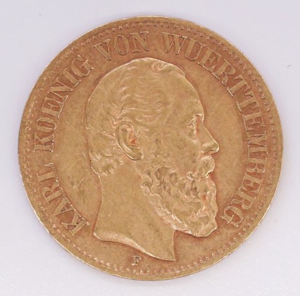 Münze: 10-Mark-Stück des Königreichs Württemberg, geprägt in Stuttgart zur Zeit von König Karl I. (1864–1891), aus dem Nachlass von Karl Asmund Kappeler (1844–1924), Kaufmann in Kolumbien
