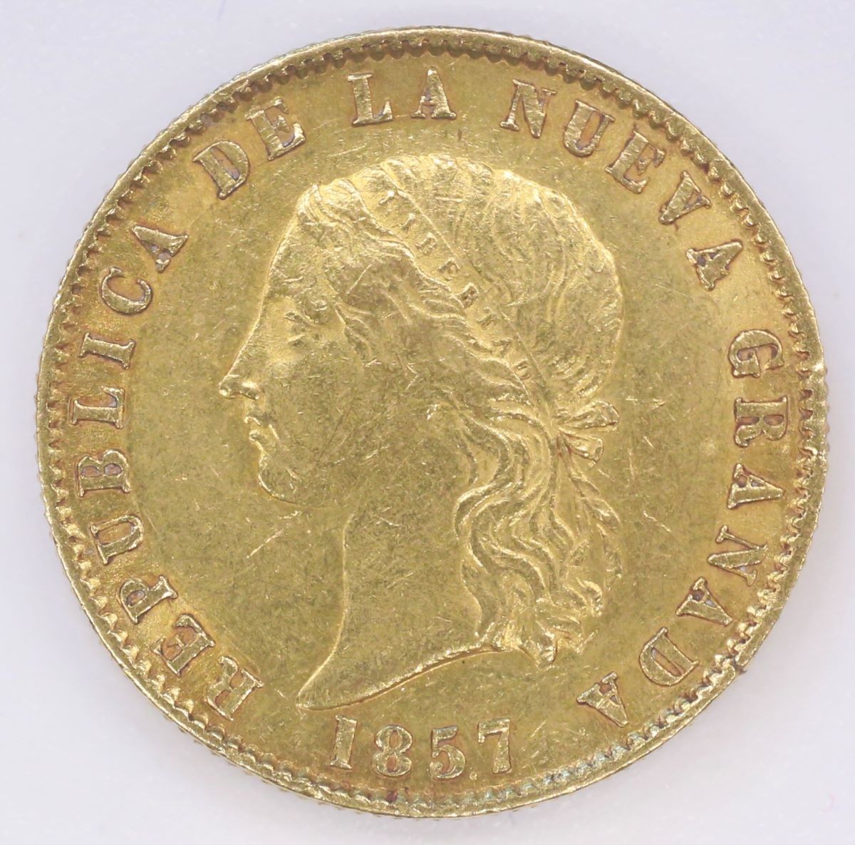 Vs.: Umschrift: «REPUBLICA DE LA NUEVA GRANADA». In Perl- und Linienkreis Frauenbüste mit am Hinterkopf mit Schleife gebundenem Haarband mit Inschrift «LIBERTAD» (Allegorie der Freiheit) nach links, darunter «1857».