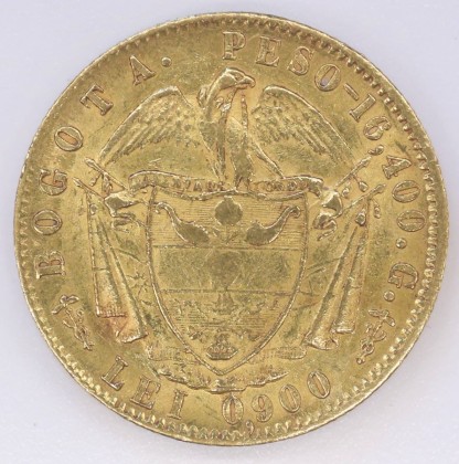 Rs.: Umschrift: «BOGOTA . PESO – 16,400 . G .». In Perl- und Linienkreis von einem Kondor bekrönter spitzer Wappenschild der Republik Neugranada. Kondor mit ausgebreiteten Flügeln (Symbol der Freiheit), nach rechts blickend, mit einem Lorbeerkranz im Schnabel (Symbol des Siegs und Ruhms), hinter ihm über seinen Läufen ein Spruchband mit Aufschrift «LIBERTAD Y ORDEN» (Freiheit und Ordnung). In drei horizontale Felder geteilter Wappenschild, oben Granatapfel (Erinnerung an Nueva Granada, dem alten Namen für Kolumbien) zwischen Füllhörnern, in der Mitte Lanze mit phrygischer Mütze, unten mit zwei Segelschiffen, eines auf dem Pazifik, das andere auf dem Atlantik, dazwischen die Landenge von Panama (Symbol der Handelsbeziehungen von Kolumbien), Schild auf gekreuzten Lanzenfahnen, darunter die Angabe «LEI 0,900», von zwei Caducei (Hermes- oder Merkurstab, Symbol für Fruchtbarkeit und Reichtum) flankiert.