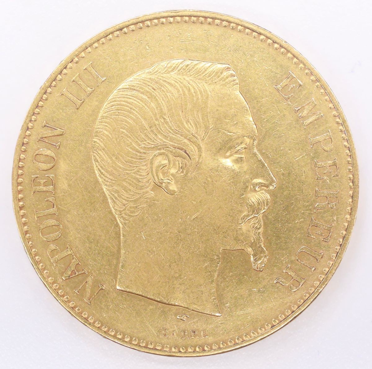 Münze: 100-Francs-Stück des Kaiserreichs Frankreich, geprägt in Paris zur Zeit von Kaiser Napoléon III. (1852–1870), aus dem Nachlass von Karl Asmund Kappeler (1844–1924), Kaufmann in Kolumbien