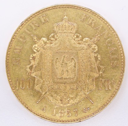 Rs.: Umschrift: «EMPIRE – FRANÇAIS». In Perl- und Linienkreis Wappenschild mit dem nach rechts blickenden napoleonischen Adler, der mit gespreizten Fängen auf einem Blitzbündel (Donnerkeil) steht und seine Flügel ausgebreitet hat. Schild gerahmt von der Collane des Ordens der Ehrenlegion mit abgehängtem fünfzackigem Stern und auf drapiertem, mit Bügelkrone (mit Kreuz auf Reichsapfel auf Scheitelpunkt) bekröntem Hermelinmantel, dieser auf gekreuzten Zeptern (Symbol für die weltliche Herrschaft), das rechte Zepter bekrönt mit der Darstellung von Kaiser Karl dem Grossen, thronend mit Krone, Zepter und Reichsapfel, das linke Zepter mit Schwurhand (Symbol für die Gerechtigkeit, «main de justice»), die Zepter zwischen «100 – FRs», darunter «A 1857 (Anker)». (A = Zeichen der Pariser Münzstätte, Anker = Zeichen des Generalgraveurs Désiré-Albert Barre (1855–1878)). Über dem Wappenschild drei Bienen. Links und rechts der Krone fallen entlang des Mantels gekräuselte Infuln herunter (Sinnbild der weltlichen und geistlichen Macht).