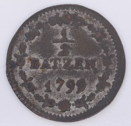Rs.: In Strichelkreis die Angaben «1/2 / BATZEN / 1799» in einem Blütenkranz.