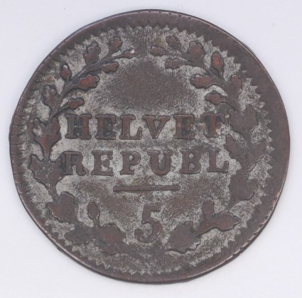 Vs.: In Strichelkreis die Angaben «HELVET / REPUBL / 5» zwischen unten gebundenen Eichenzweigen (Symbole der Stärke, Treue und Einheit).