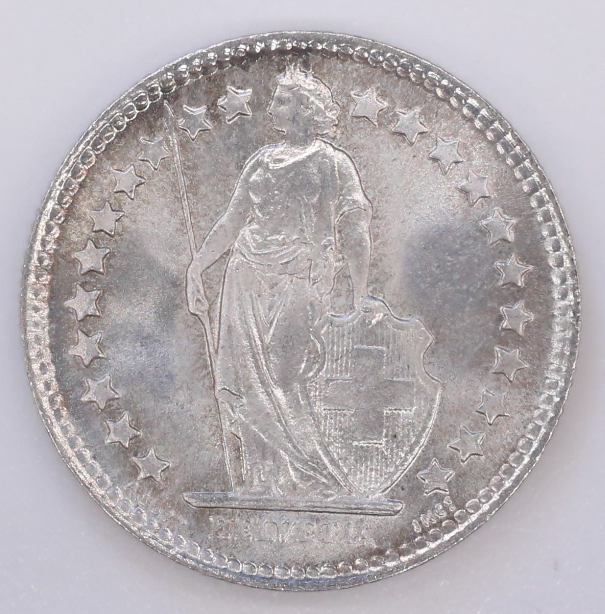 Vs.: In Perl- und Linienkreis und auf einer Bodenplatte stehende, nach links blickende Helvetia in Toga und mit Lorbeerkranz im Haar (Symbol des Siegs und Ruhms), welche die Schweiz repräsentiert und Unabhängigkeit, Freiheit, Neutralität und Einigkeit verkörpert, die Linke den Wappenschild in Renaissanceform mit dem Schweizerkreuz stützend, die Rechte einen Speer (Symbol der Wehrhaftigkeit) haltend, umringt von 22 Sternchen, stellvertretend für die 22 «Vollkantone» der Schweizerischen Eidgenossenschaft, unter Bodenplatte «HELVETIA», seitlich davon am Rand «A. BOVY», «INC[IDI]T» (hochgestelltes T) (incidit = hat gestochen).