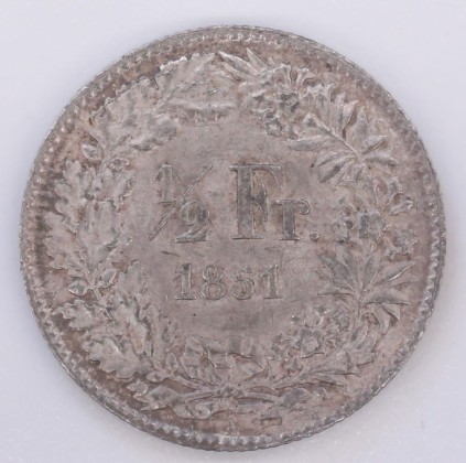 Rs.: In Perl- und Linienkreis die Angaben «1/2 Fr. / 1851» in einem unten mit Schleifen gebundenem Kranz aus Alpenrosen (Alpenblume, Symbol für die Alpen bzw. die Schweiz als Alpenland) und Eichenzweigen (Symbol der Stärke, Treue und Einheit). Darunter «A», das Zeichen der Münzstätte Paris.