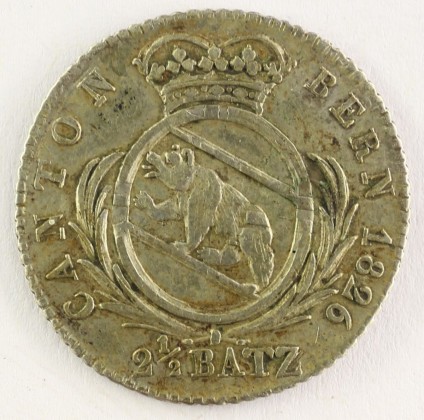 Vs.: Umschrift: «CANTON – BERN 1826». In Strichelkreis mit Lilienkrone bekröntes ovales Berner Wappen (heraldisch nach rechts aufwärtsschreitender Bär mit erhobener linker Vordertatze), zwischen Palmzweigen (Symbole des Siegs und Ruhms), im Abschnitt die Angaben «2 1/2 BATZ».