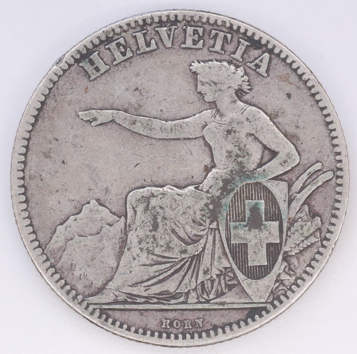 Vs.: Umschrift: «HELVETIA». In Perl- und Linienkreis sitzende Helvetia nach links (allegorische Figur, welche die Schweiz repräsentiert und Unabhängigkeit, Freiheit, Neutralität und Einigkeit verkörpert), die Linke auf den spatenförmigen Schild mit dem hochovalen Schweizer Wappen gelegt, die Rechte über das Alpenpanorama im Hintergrund ausstreckend. Hinter der Allegorie Sterzen des Pflugs und drei Ähren, vermutlich Weizen da ohne Grannen (Symbole der Prosperität). Im Abschnitt Name des Graveurs «KORN».