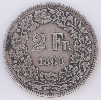 Rs.: In Perl- und Linienkreis die Angaben «2 Fr. / 1863» in einem unten mit Schleifen gebundenem Kranz aus Alpenrosen (Alpenblume, Symbol für die Alpen bzw. die Schweiz als Alpenland) und Eichenzweigen (Symbol der Stärke, Treue und Einheit). Darunter «B», das Zeichen der Münzstätte Bern.