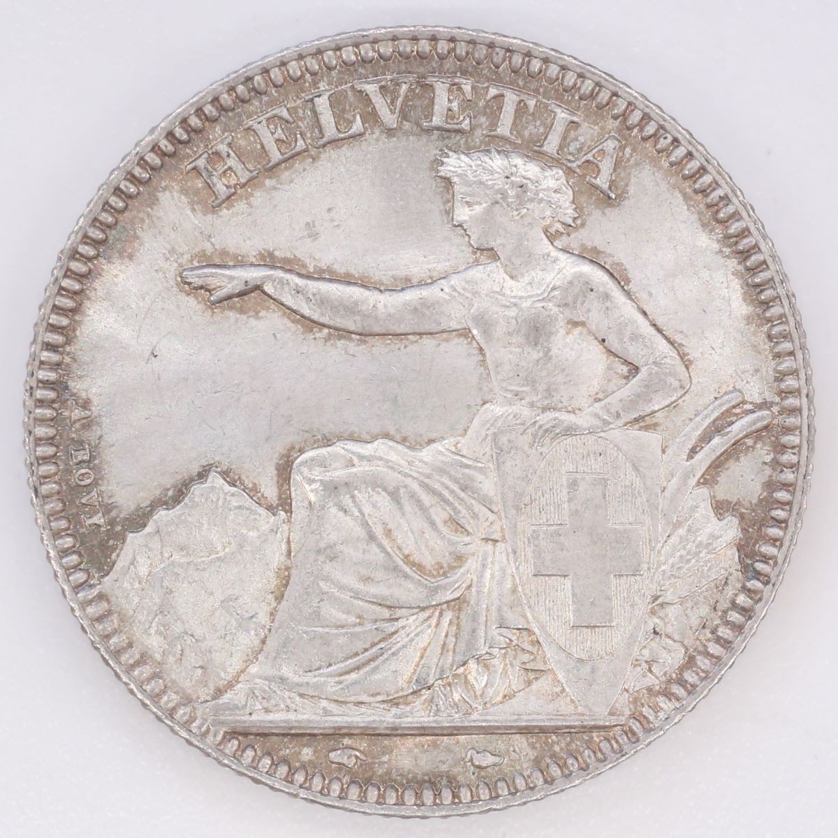 Im 16. Jh. kam der Begriff «Helvetia» als Bezeichnung für das Territorium der damaligen Schweiz auf, da die Eidgenossen als Nachfahren der Helvetier, eines keltischen Volksstamms, betrachtet wurden. Die Darstellung der Helvetia als Landesmutter trat im späten 17. Jh. in Erscheinung. Sowohl katholische wie protestantische Gläubige konnten sich mit der Allegorie identifizieren. Als eidgenössische überkonfessionelle und überregionale Leitfigur wurde sie im 19. Jh. wichtig, da sich die Bevölkerung im neuen Nationalstaat vor 1848 zunächst mit ihrem jeweiligen Kanton identifizierte. Als Verkörperung abgebildet oder als Begriff erwähnt, war Helvetia insbesondere auf Münzen und Briefmarken präsent. Nach der Gründung des Schweizer Bundesstaats 1848 übernahm der Bund die Münzhoheit. Helvetia war nun ein Sinnbild für eine stabile Währung. Zuerst vor einem Alpenpanorama sitzend, ist sie seit 1874 stehend und mit einem Speer bewaffnet dargestellt. Das vorliegende Exemplar ist eines der ersten Frankenstücke mit der sitzenden Helvetia.