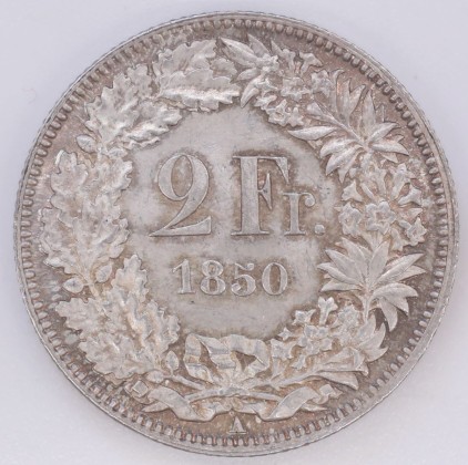 Rs.: In Perl- und Linienkreis die Angaben «2 Fr. / 1850» in einem unten mit Schleifen gebundenem Kranz aus Alpenrosen (Alpenblume, Symbol für die Alpen bzw. die Schweiz als Alpenland) und Eichenzweigen (Symbol der Stärke, Treue und Einheit). Darunter «A», das Zeichen der Münzstätte Paris.